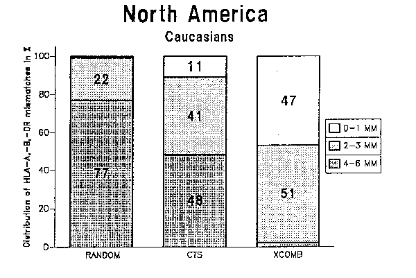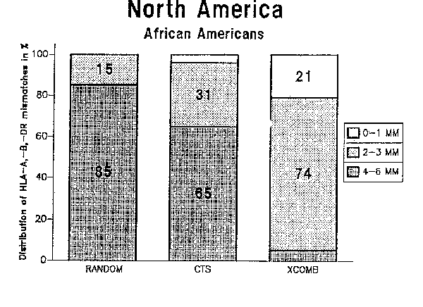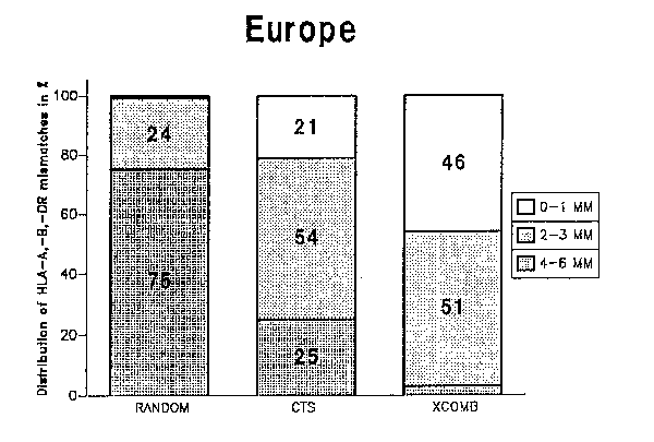 Figure 1 shows the fractions of different HLA-A,-B,-DR match grades that can be obtained in Europe with random allocation and the XCOMB allocation method. The actual results reported by European centers to the CTS study are shown for comparison. It is evident that the fraction of good matches can be improved by means of organ allocation by the XCOMB method. The corresponding results for North American Caucasians are shown in Figure 2, and those for African Americans in Figure 3.