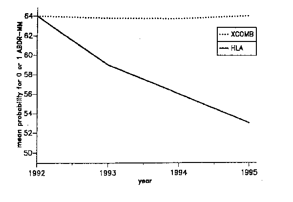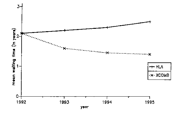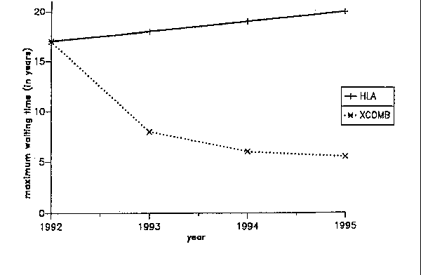 During the last year we have struggled with the problem of equitable kidney allocation. A strong effect of HLA matching on cadaver kidney survival has repeatedly been shown in this newsletter. However, if kidneys were allocated strictly according to the best possible HLA match, patients with rare HLA phenotypes would be at a disadvantage. This would especially affect racial minorities. Thomas Wujciak performed extensive computer simulations and developed a weighted point system which is self-adjusting to the dynamics of a waiting list. His initial results were published a few months ago and he has since been able to improve the allocation model. It now takes the following parameters into account: HLA-A,-B,-DR match, waiting time, race, priority of local transplant, kidney exchange balance for each center, and probability for a 0-1 HLA-A,-B,-DR mismatch in 1000 kidney offers ("matchability"). The exact details of the allocation algorithm are available to anyone who is interested. The following graphics show the power of the newest version, termed "XCOMB". Waiting list conditions and donor availability were chosen as realistic , as possible based on information published by Eurotransplant and UNOS, and on HLA frequencies derived from the CTS file. The results were simulated over a 6-year period, assuming that the best suitable patient would be transplanted in only 50% of the selections.